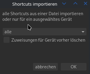 Öffne rechts oben in Darktable die Einstellungen (Zahnrad) und wechsel in den Reiter „Shortcuts“. Rechts unten findest du den Button „importieren“.