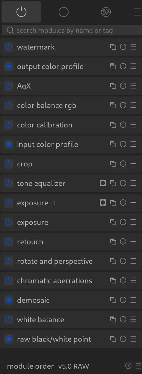 - Richtung: Die Verarbeitung läuft strikt von unten nach oben. Das RAW-Bild startet am unteren Ende der Modulliste, und jedes aktivierte Modul legt eine neue Bearbeitungsschicht darüber.