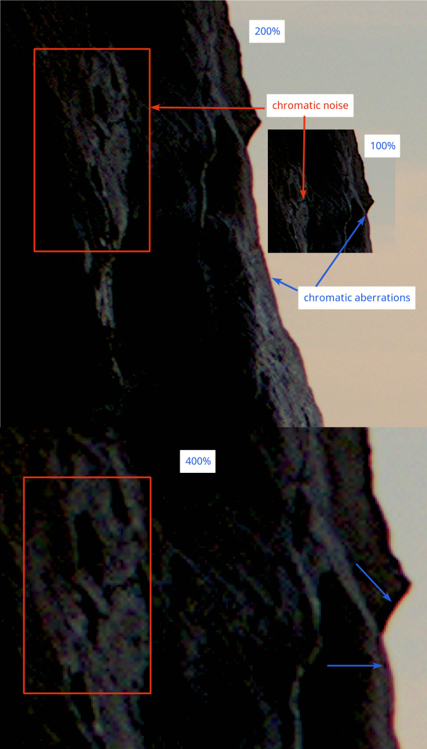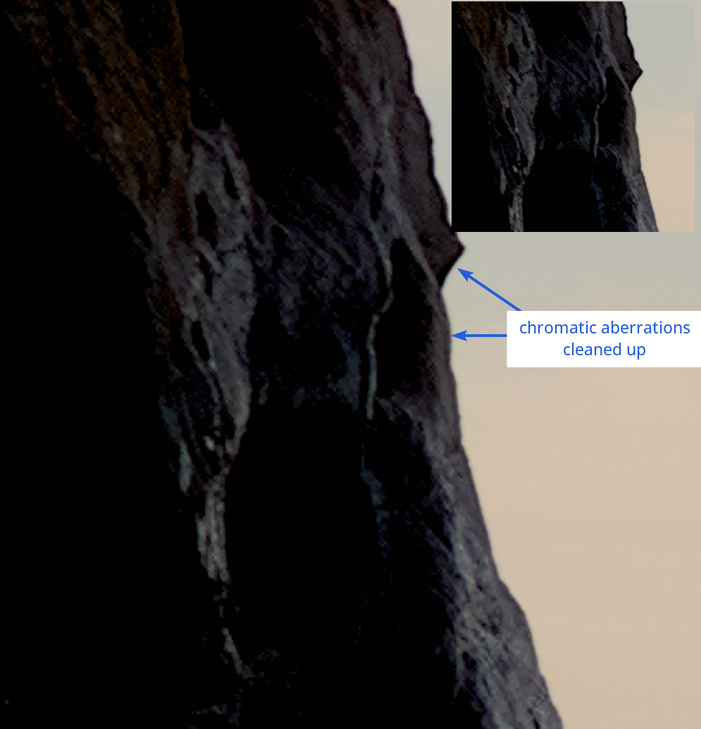 While the RAW module tries to physically shift the color channels over each other, this module works more like an intelligent filter: it specifically looks for typical colors of color fringes (purple/green) at edges and desaturates or recolors them.