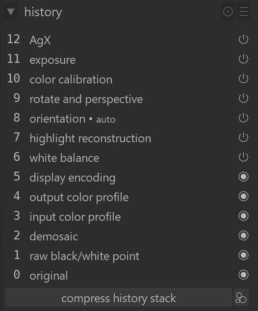 • Every time you enable, disable, move, or change a processing module, darktable adds a new step to the top of the history stack.