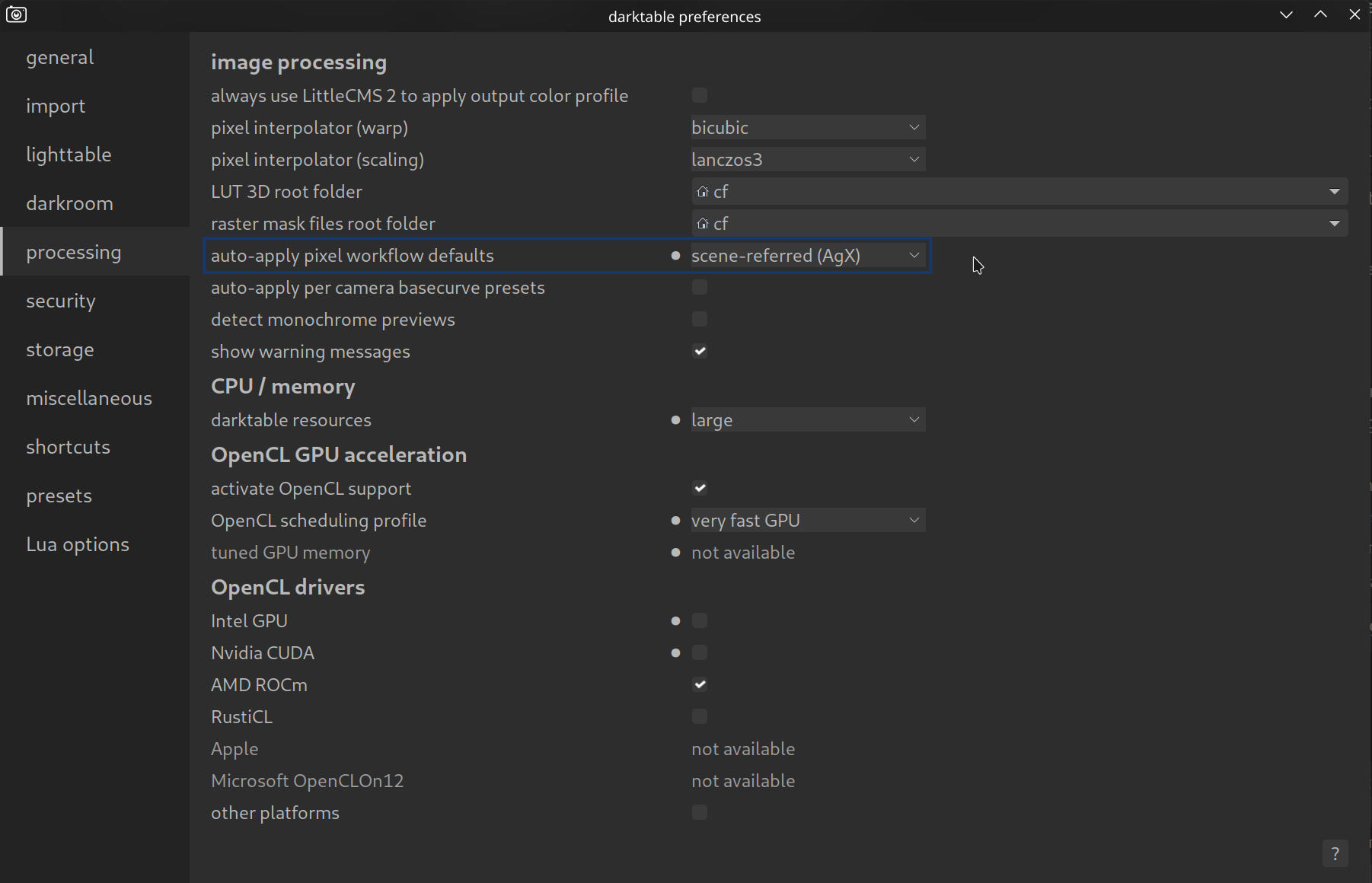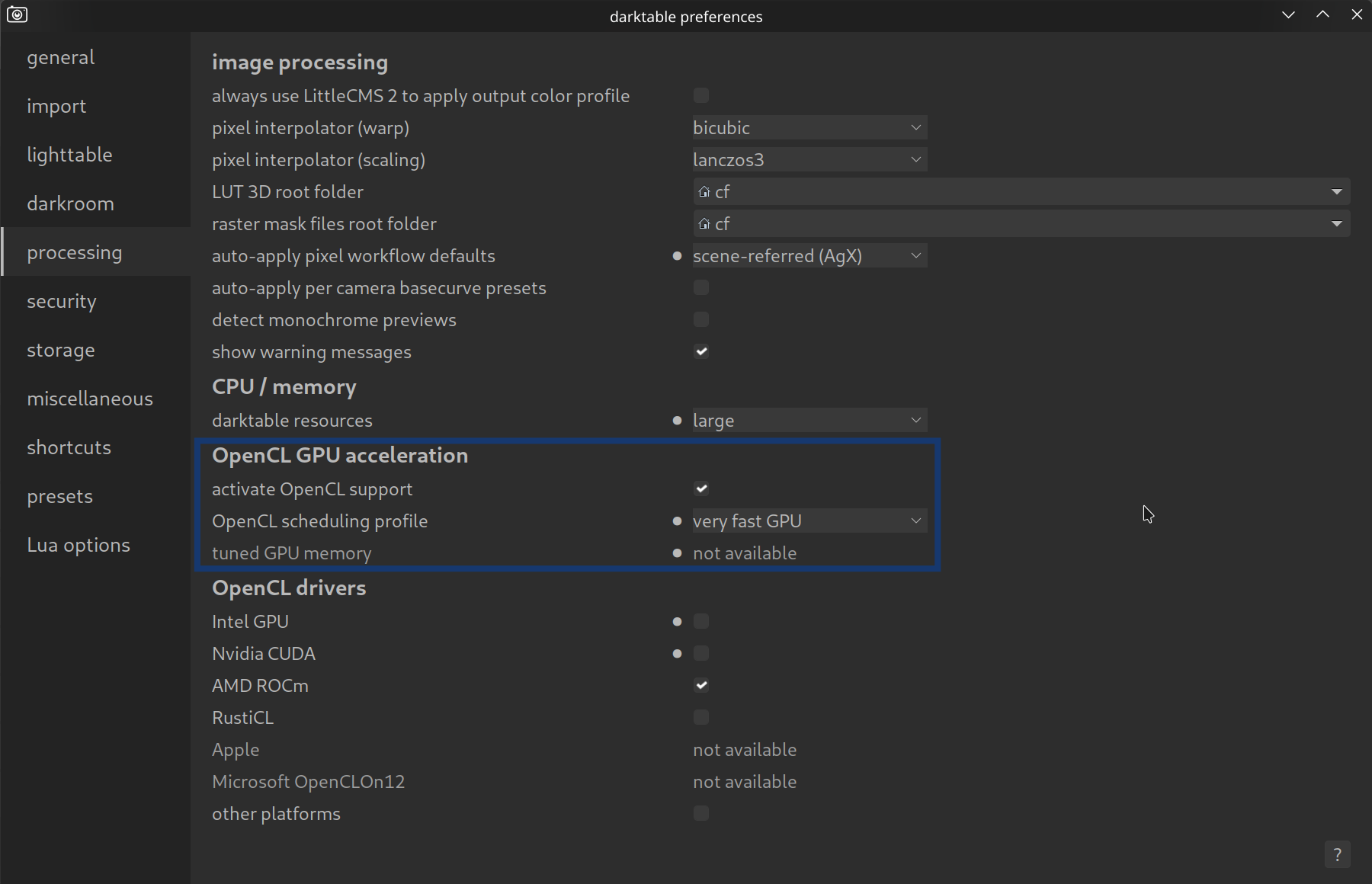 Tip: If the option is greyed out, you will probably be missing the right drivers for your graphics card. Update your graphics card drivers (NVIDIA/AMD) and restart DarkTable. At startup, Darktable automatically checks whether the graphics card can be used.