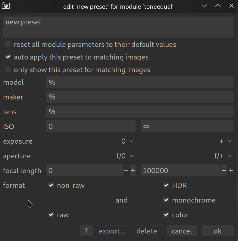 - Logic: For example, you can create a preset for “High ISO Denoise” that is only applied if the ISO > 1600 and the camera is exactly your model.
