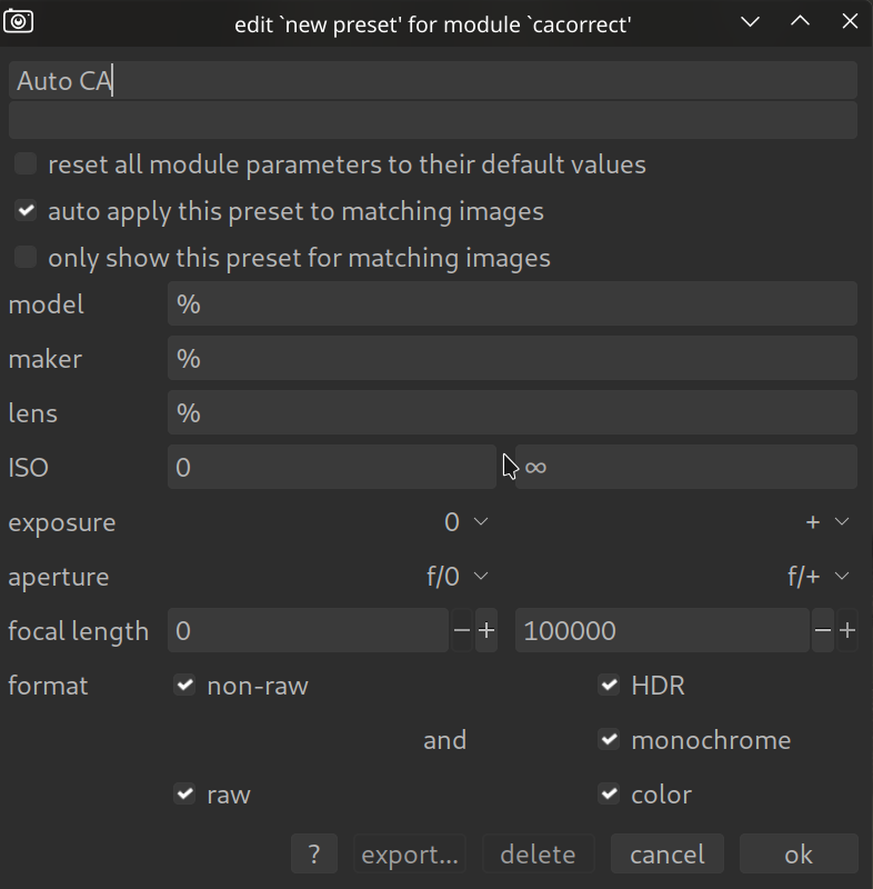 - Give the preset a name, e.g., “Auto CA”.