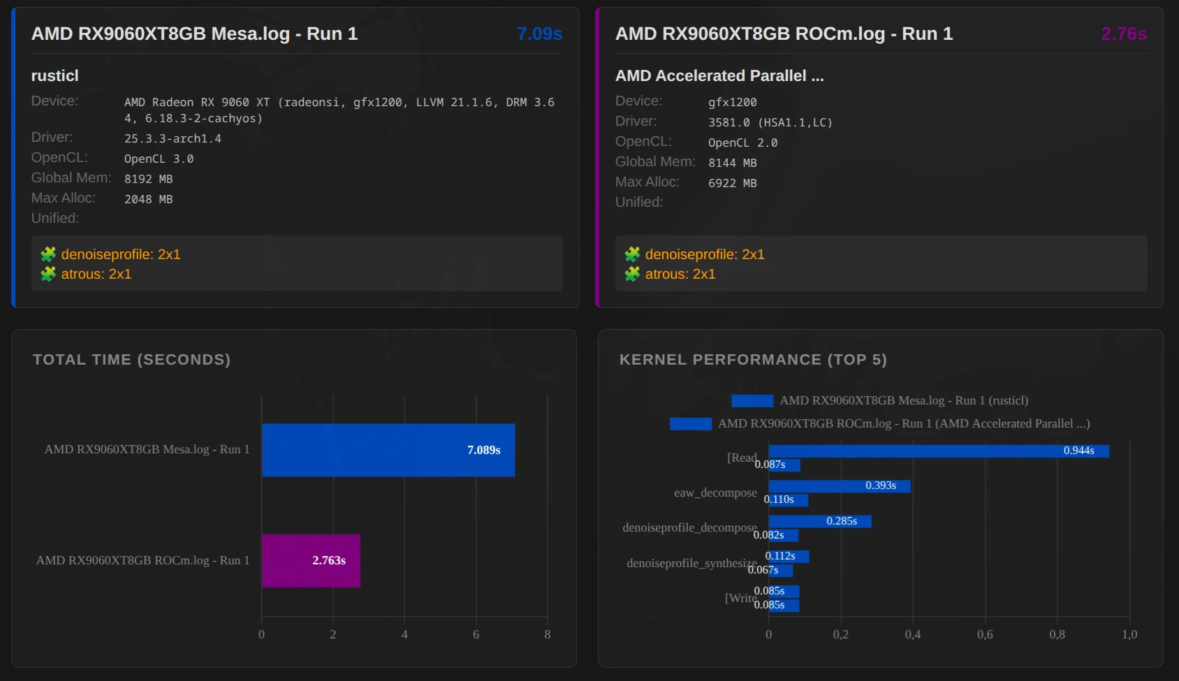 Example: AMD RX 9060 XT with 8GB (gfx1200) – OpenCL-Mesa (RustiCl) vs. ROCm