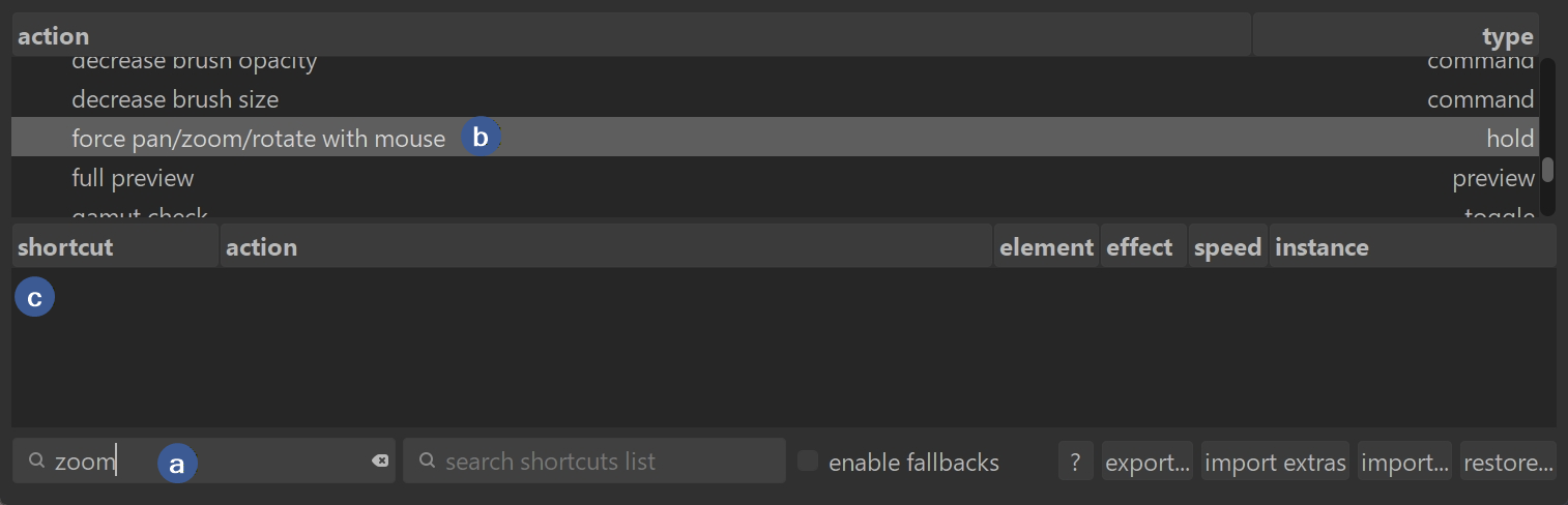 Typing zoom (a) shows and scrolls through all shortcuts in the bottom half that have an action associated with the word zoom; and highlights the action in the top half as well (b):