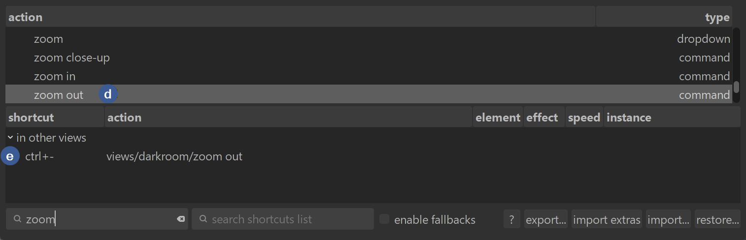 - zoom out (d) – has a shortcut (e)