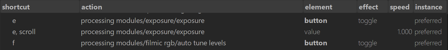 - A shortcut can only do one thing per view (lighttable vs darkroom).