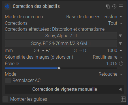 Darktable a accès à une énorme base de données (Lensfun). Il lit dans les métadonnées de la photo exactement quel appareil photo et quel objectif vous avez utilisés, et applique le profil de correction approprié.