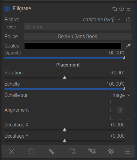 Pour plus d’informations, consultez la page du manuel officiel de darktable : filigrane [EN].