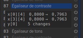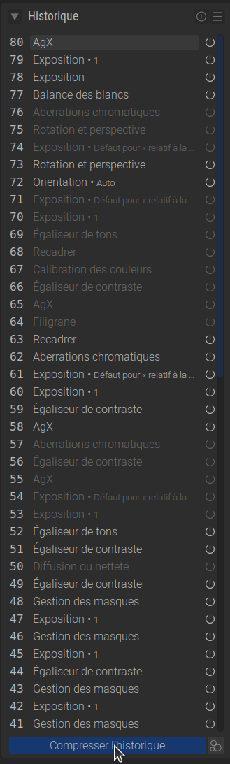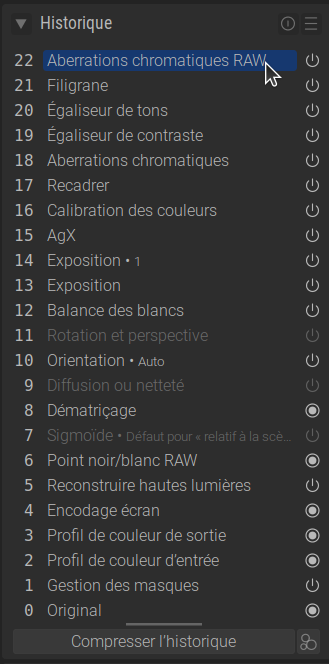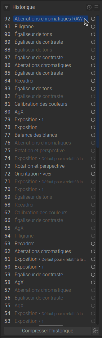 - Chaque fois que vous activez, désactivez, déplacez ou modifiez un module de traitement, darktable ajoute une nouvelle entrée en haut de la pile d’historique.