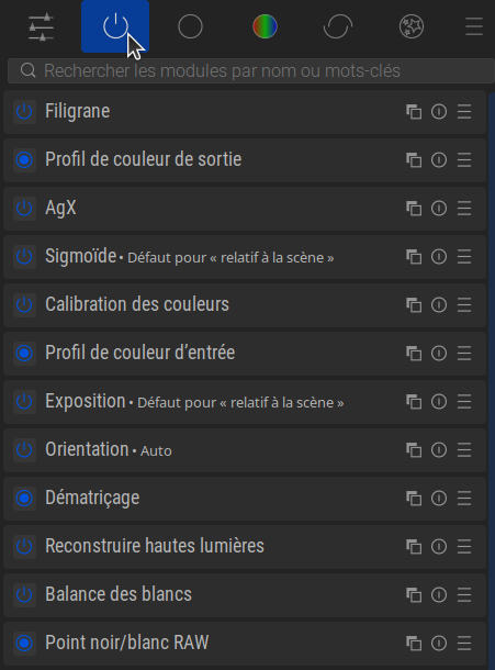 Pour le moment, examinons les Modules Actifs. Les points suivants sont TOUS importants pour travailler plus tard en toute décontraction avec darktable.