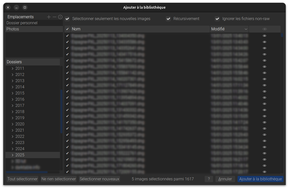 Si votre collection est organisée en sous-dossiers, activez Récursivement. Si, comme beaucoup, vous ne souhaitez pas gérer ou modifier vos photos JPEG avec darktable, activez également Ignorer les fichiers non-raw.