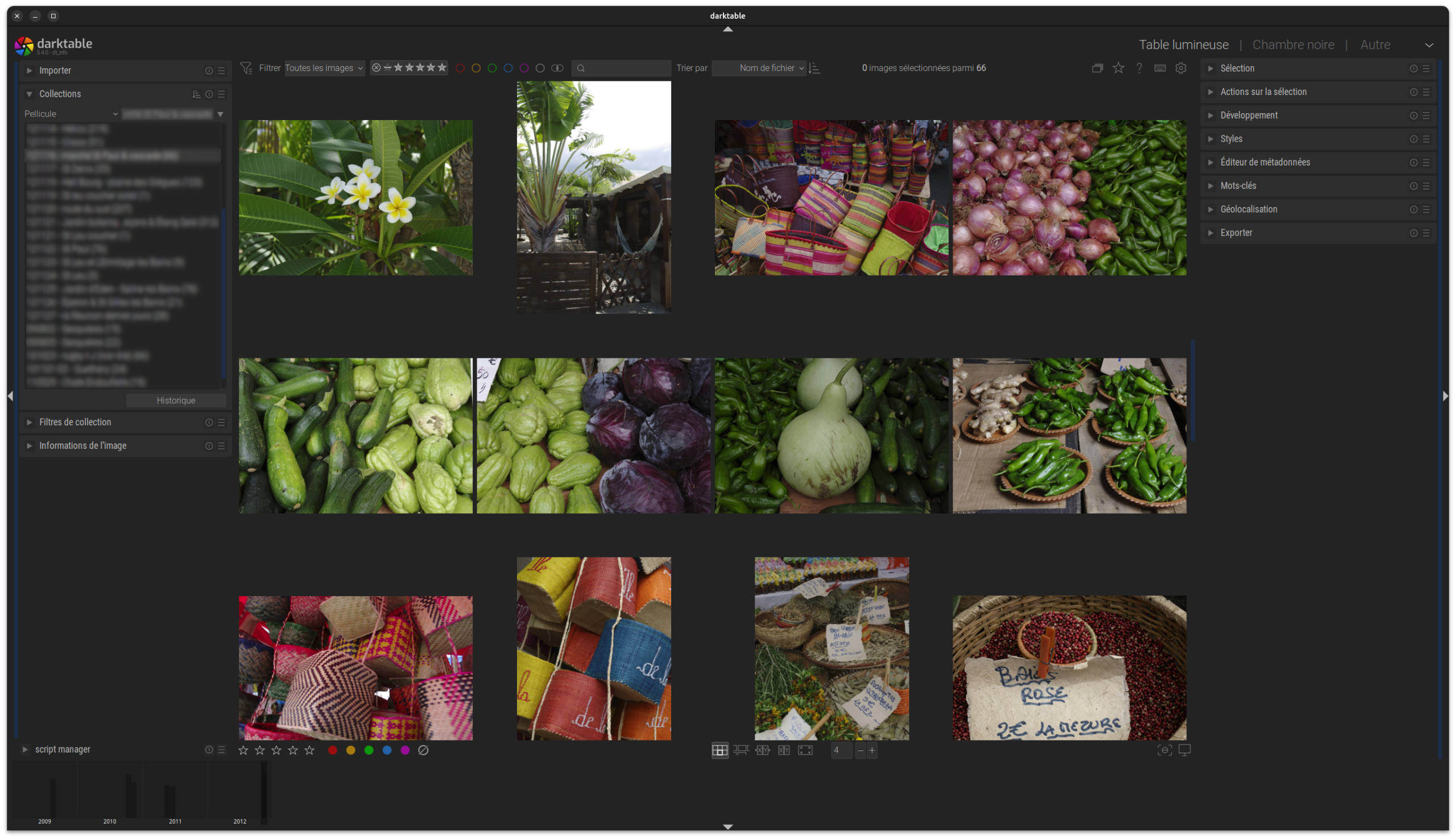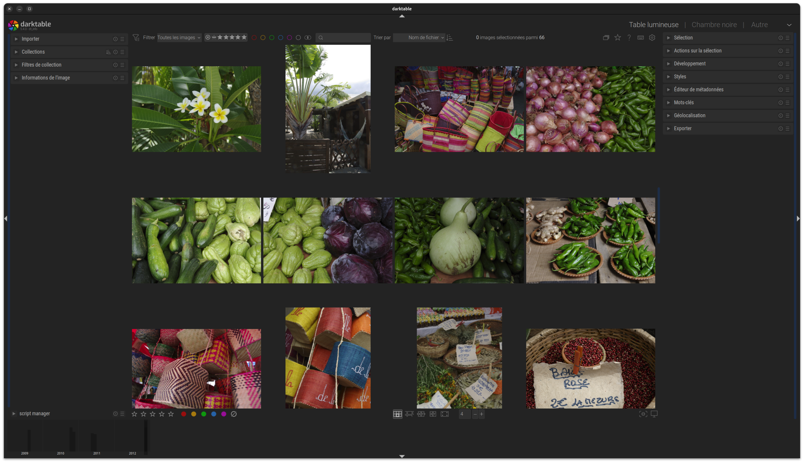 La première vue dans darktable est la Table Lumineuse qui sert à gérer, à trier et à visualiser vos images.