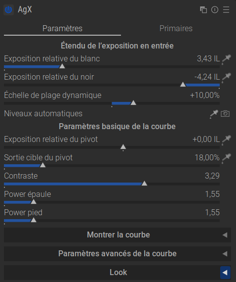 la couleur de base. Corrigez la balance des blancs afin que le blanc soit vraiment blanc. - AgX (ou Sigmoid) :