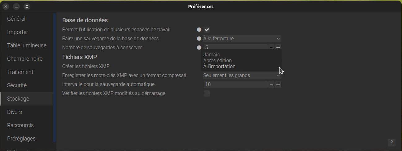 Conseil de pro : vérifiez dans les Préférences sous Stockage pour voir si l’option d’écriture des fichiers sidecar est activée. Il est fortement recommandé de sélectionner À l’importation ou Après l’édition pour l’option Créer les fichiers XMP.