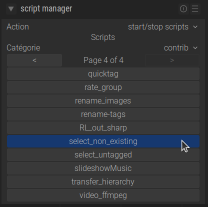 Si vous voyez le module Script Manager en bas à gauche dans la vue Table Lumineuse : cliquez dessus, sélectionnez la catégorie contrib, puis cliquez surselect_non_existingpour le lancer. - Méthode B (manuellement) :