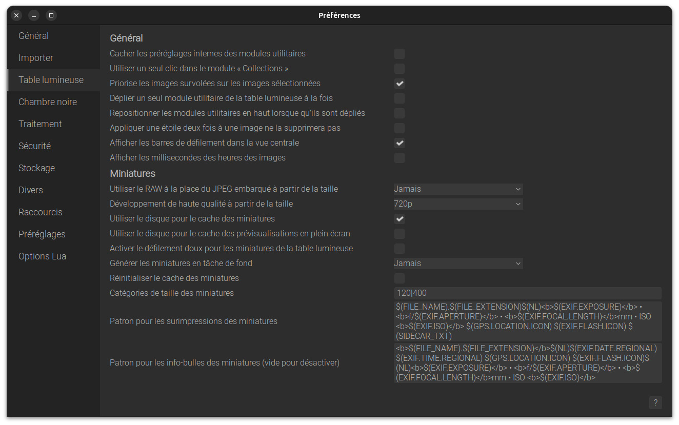 Pour plus d’informations, consultez la page du manuel officiel de darktable : Les Préférences de la Table Lumineuse [EN].