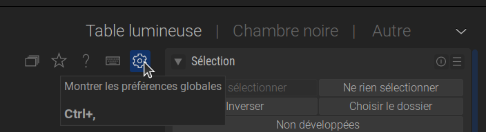 Les préférences de darktable sont accessibles en cliquant sur l’icône en forme d’engrenage située dans le coin supérieur droit :