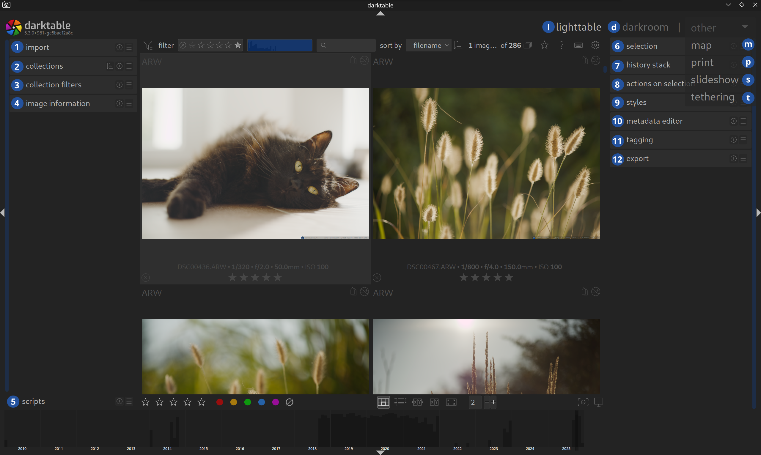 - Obere Leiste: Enthält Informationen über Darktable (Version), Filter und Zugriff auf globale Einstellungen.