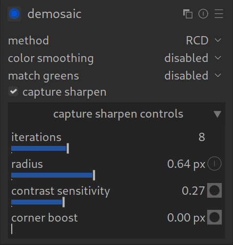 - Perfekter Zeitpunkt: Die Schärfung wird auf die rohen Pixeldaten angewendet, noch bevor andere Module das Bild verändern. Das minimiert Artefakte.
