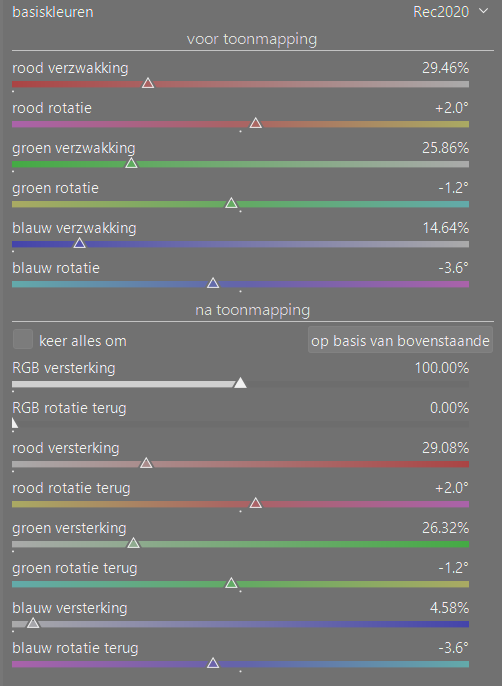 De aanpassingen moeten dus voor het toonmappen plaatsvinden, anders ontstaan er mogelijk fouten. Dan doet de toonmapper zijn werk, maar dat betekent dat er gewijzigde kleuren blijven bestaan. Je moet de aanpassingen na de toonmapping weer te niet doen. Verzwakkingen opheffen en rotaties terugdraaien: het onderste gedeelte doet dat. Ook hier weer met zorg gekozen standaardwaarden.