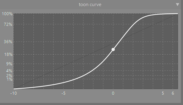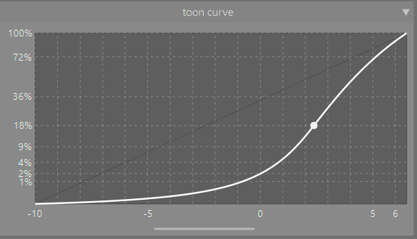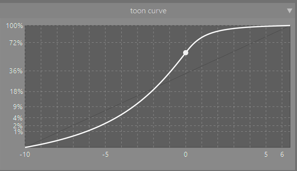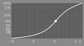 Alle toonmappers werken met sigmoid-curves, dat kan niet anders. Deze S-vormige curves schetsen het verband tussen de lichtsterkte van de foto en die op het scherm. Op de X-as staat de helderheid van de foto (van donker naar licht (in EV’s)) en op de Y-as van het scherm (van donker naar licht (in %)). De witte punt staat hier bij 18% grijs (middle gray).