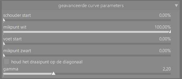 De gamma schuif is een wat vreemde eend in de bijt: het effect ervan is sterk vergelijkbaar met die van doelbelichting draaipunt. Die schuif is er, maar waarom? Je kan hem weg klikken door het vinkje bij houd het draaipunt op de diagonaal te zetten. Alleen beïnvloed je dan ook de eigenschappen van de belichting draaipunten. Laat dus daarom alles maar op default staan en negeer de optie maar.