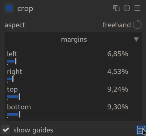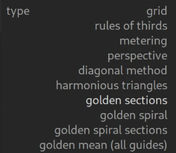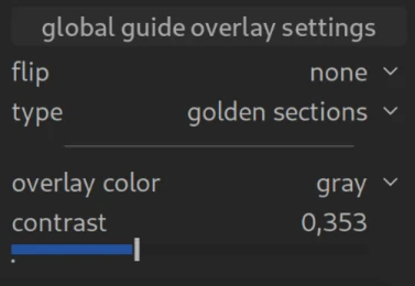 Dit is misschien wel de nuttigste functie voor beginners. Darktable legt lijnen over het beeld waaraan je je kunt oriënteren. Zet het vinkje achter ’toon hulplijnen’ en druk op het icoontje achteraan de regel om de juiste instellingen te kiezen. Let met name even op ’type’ en de mogelijkheden die dat biedt. Deze instelling heeft sneltoets ‘g’.