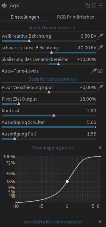 Wenn Darktable im szenenbezogenen Arbeitsablauf (scene-referred workflow) läuft, werden Standardwerte angewendet. Andernfalls wählen Sie manuell die Voreinstellung blender-like|base oder smooth|base.