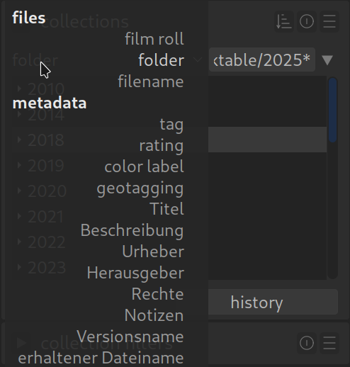 Manchmal zeigt Darktable Ordner- oder Filmrollennamen durchgestrichen an. Das ist das Zeichen dafür, dass du den Ordner auf deiner Festplatte verschoben oder umbenannt hast und Darktable ihn nicht mehr findet.