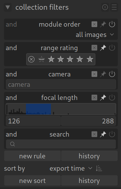 Zusätzlich zum Modul „Sammlungen“ gibt es das Modul Sammlungs-Filter (collection filters) (meist im oberen Panel). Der Vorteil hier: Es bietet grafische Buttons („Widgets“) für Sterne-Bewertungen, Kamera, Brennweite, Farbmarkierungen und viele Weitere.