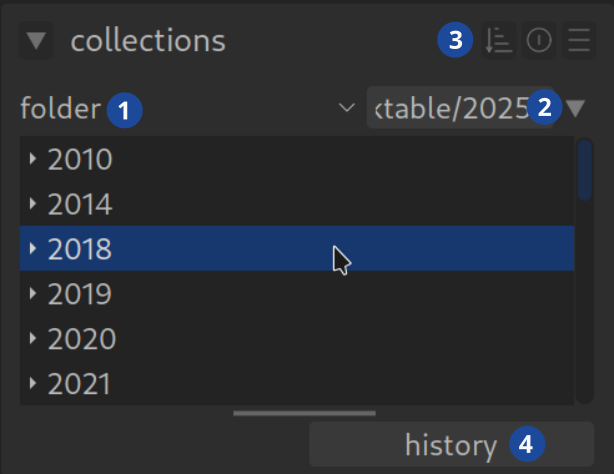 Im oberen Feld (1) wählst du das Attribut (folder) aus. Die Liste ist lang! „Filmrolle“ und „Ordner“ sind die Klassiker. Sobald du ein Attribut gewählt hast, siehst du im Feld darunter die passenden Werte (z.B. deine Ordnernamen). Oft sind diese Werte gruppiert (z.B. nach Jahr) – ein Klick öffnet die Gruppe.